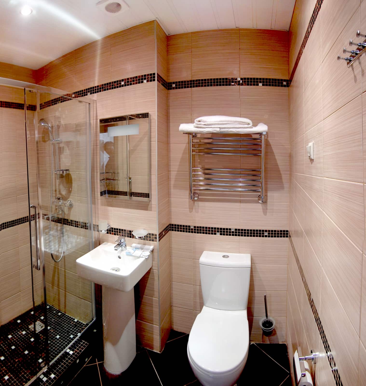 В санузле имеется душевая кабина, фен и набор полотенец.