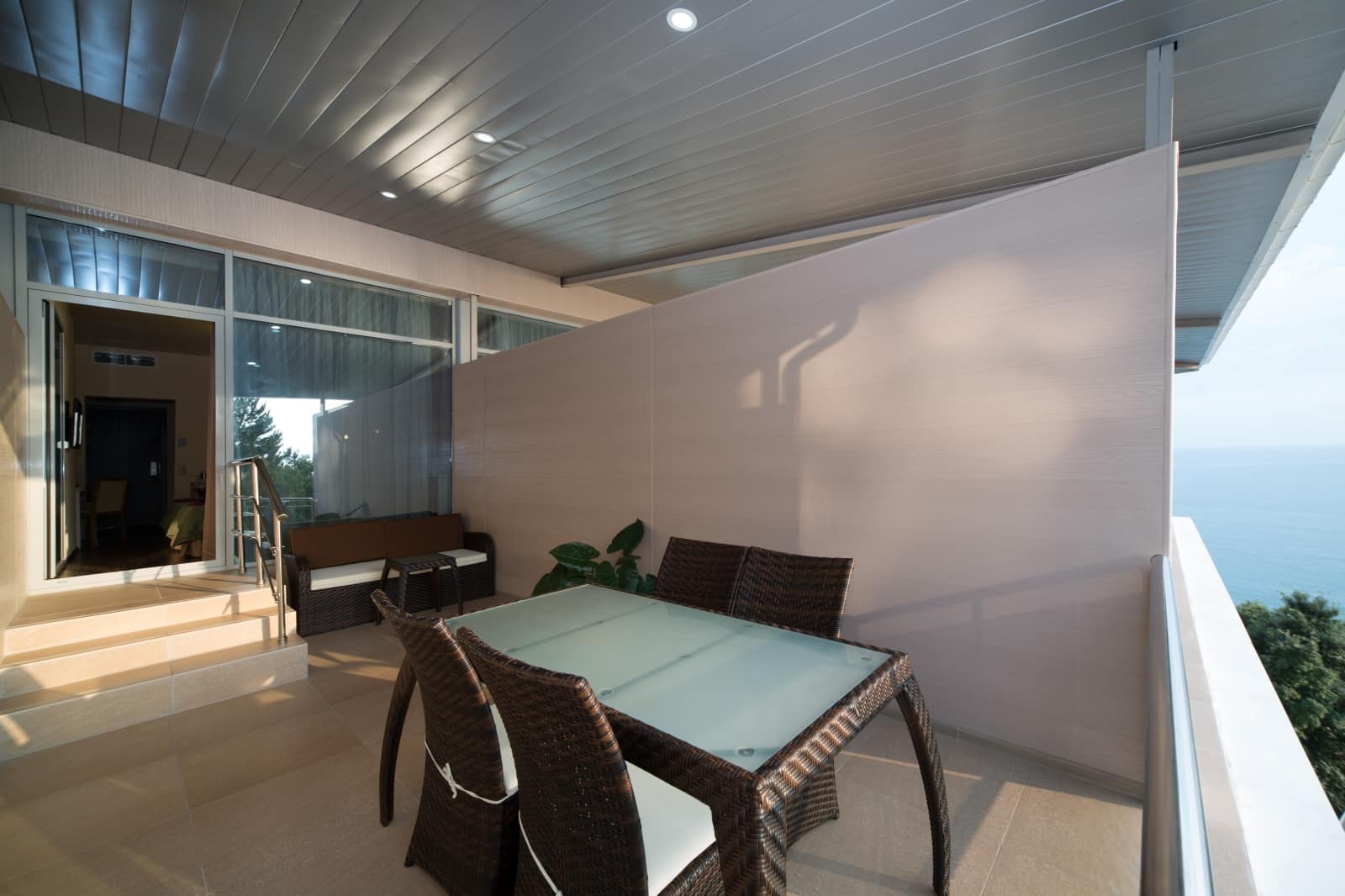 Однокомнатный номер площадью 19 кв. м с просторным балконом, где имеется плетеная мебель.
