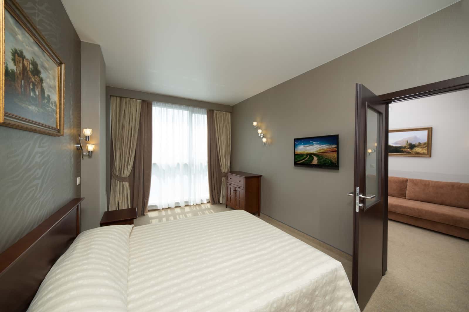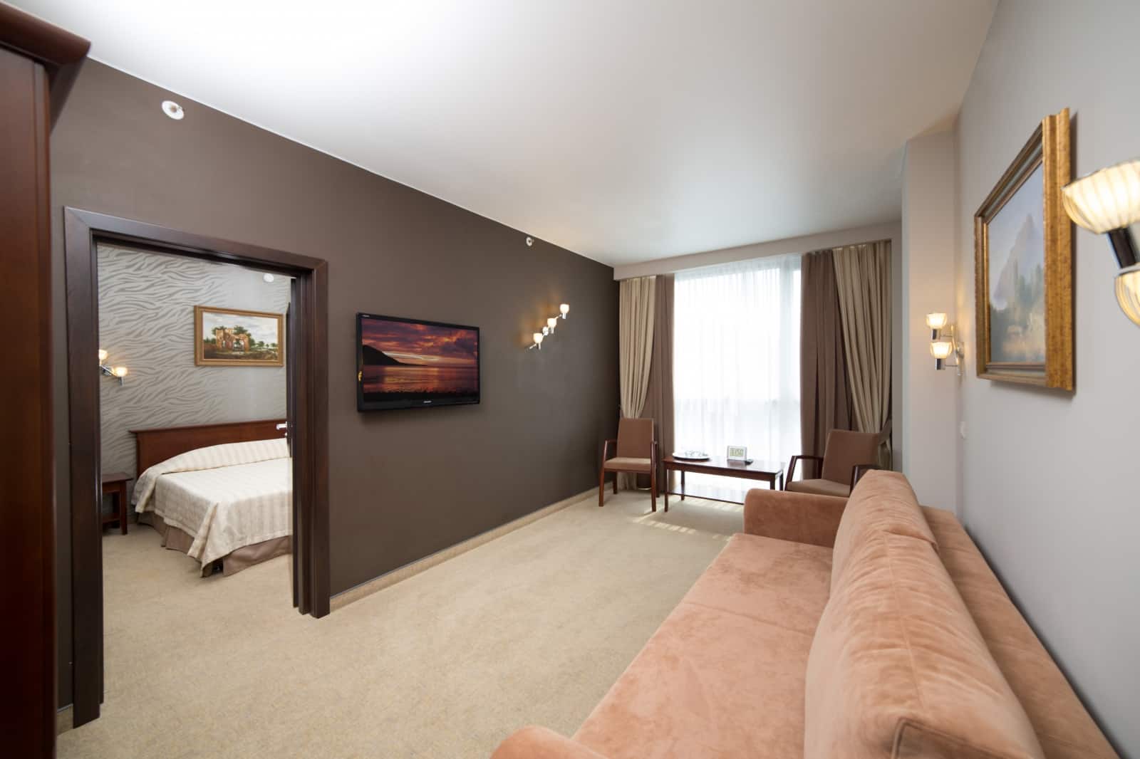 Номер площадью 38 кв.м оснащен двуспальной кроватью и диваном для размещения постояльцев.